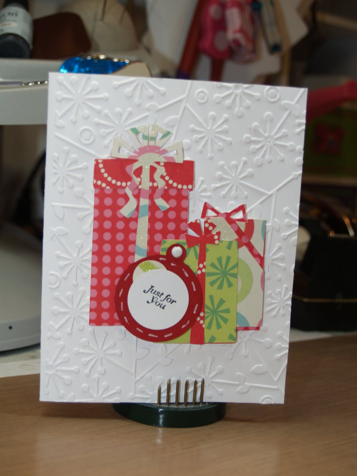 Here one using the Just Rite Christmas Charms stamps and die cut from Spellbinders that matches and of course, I couldn't leave Ms. Cricut or my favorite Cuttlebug out of the fun. The presents were cut using the Cricut and Birthday Bash and the Sizzix embossing folder called flowers and stems (looks like snowflakes to me LOL) Have a great day.